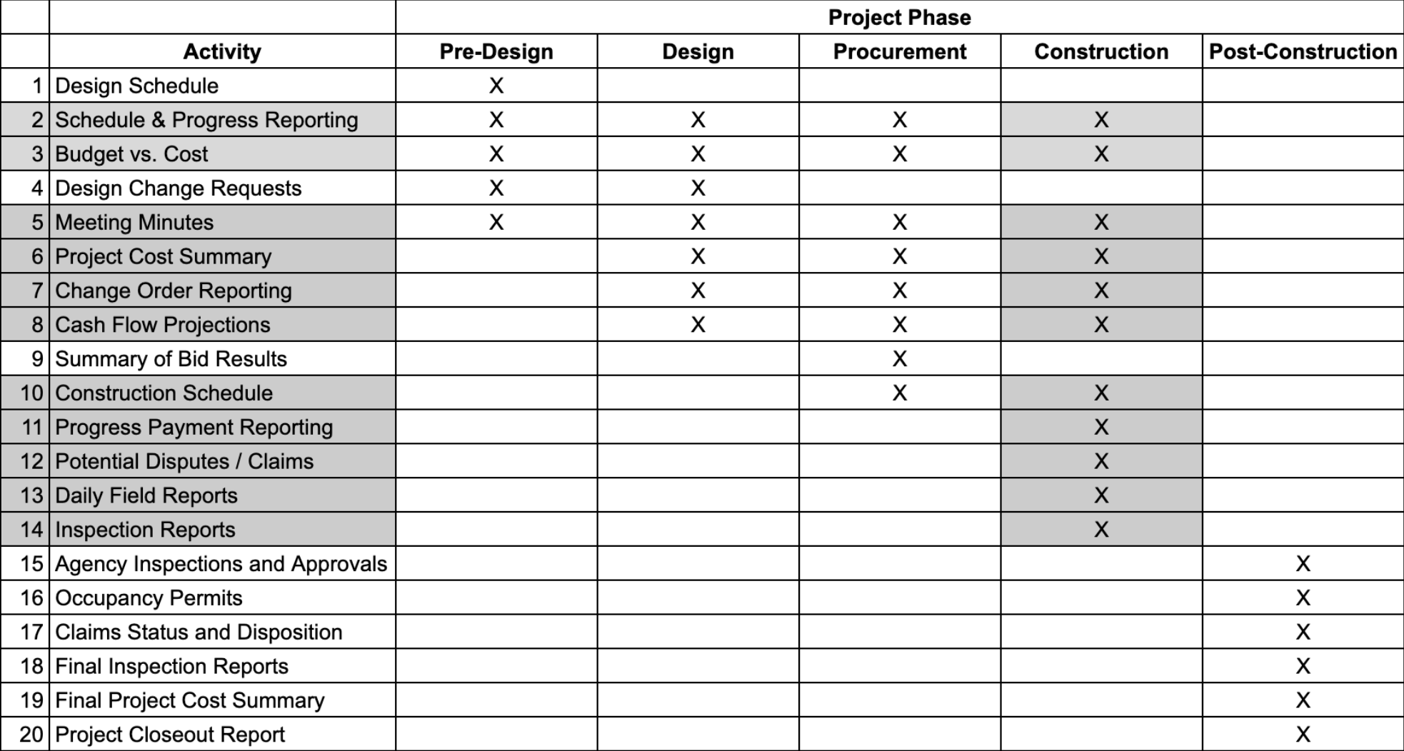 However, the Construction Management Association of America [Standards of Practice] provides the following administrative tasks of the Construction Manager (acting on behalf of the employer) during project execution and the administration and reporting requirements for all phases of the contracts. Activities during construction are shaded.